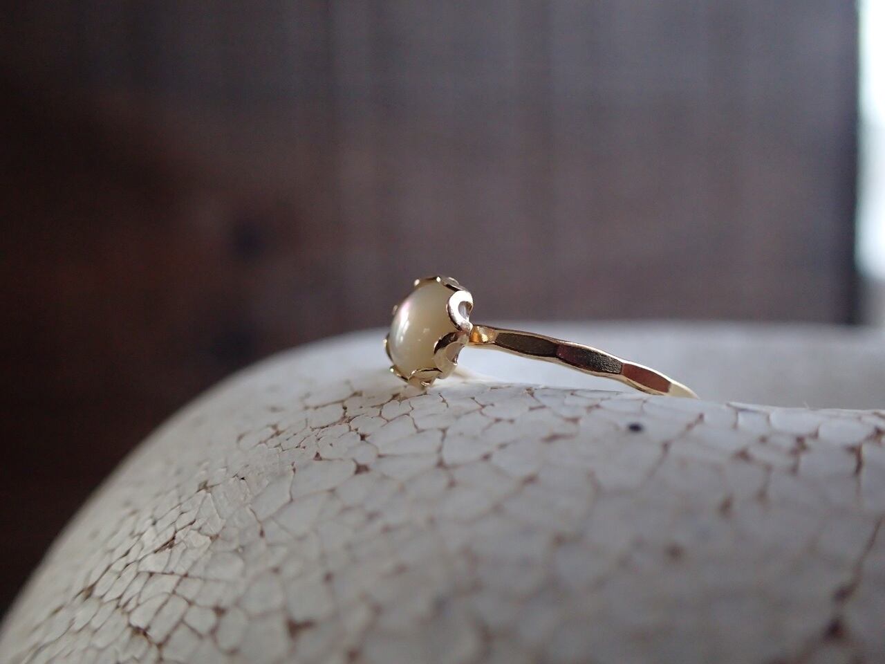 夜光貝を丁寧に磨き上げ仕立てた花形リング。雪のように純白の輝きを放つ真珠層は凛とした佇まいで自然の美しさそのもの。華奢なゴールドリング×5mmの夜光貝リングは普段使いに、重ね付けにおすすめの一点もののアクセサリー。ONEサイズ9号です(変更は出来ません)。