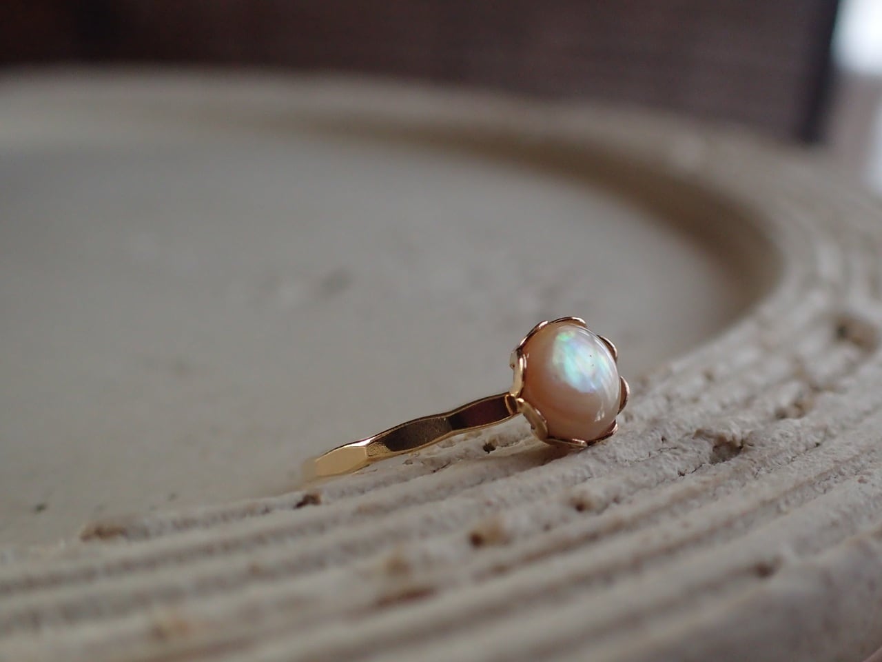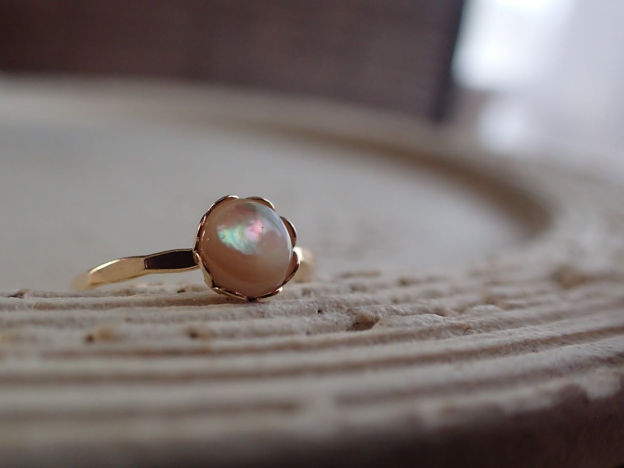 アワビ貝を丁寧に磨き上げ仕立てた花形リング。透明感のある真珠層は光の角度により虹色が浮かび上がってきます。華奢なゴールドリング×5mmのアワビ貝リングは普段使いに、重ね付けにおすすめの一点もののアクセサリー。ONEサイズ9号です(変更は出来ません)。